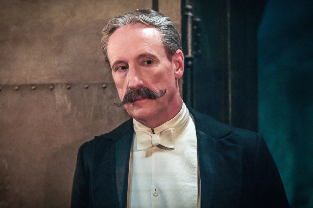 Elias has grey hair and mustache that is curled at the ends. He wears a historical-fashioned White Tie ensemble. Underneath, he wears a white shirt and a cream colored vest, matching a bowtie and Detachable Stiff White Wigtip collar. He wears a wedding ring and has a pocket watch attached to his vest.