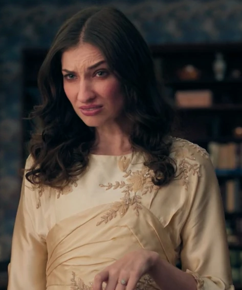 Miranda is a tall, thin woman with long dark brown hair and blue eyes. Her face is flushed and her nostrils are reddened from being ill. She wears a floor-length cream wedding dress with embroidery at the shoulders, chest, and waistline, as well as the engagement ring given to her by Roland, which Virginia brought to her during their first meeting.