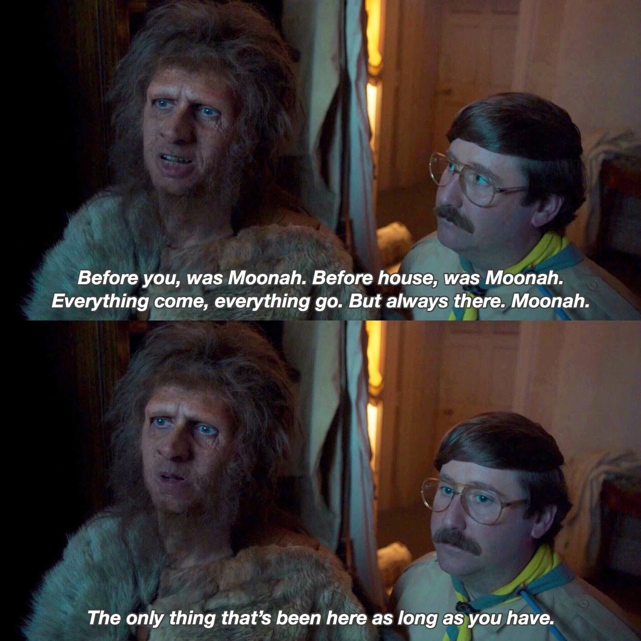 The ritual also involves most of the ghosts dancing around the middle of the dining room and chanting "moonah stonah". Robin also howls at the moon from the middle of the room.