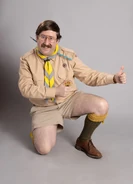 Pat is dressed in a traditional scoutmaster's uniform consisting of shorts, shirt - which has a few badges on it - and a neckerchief fastened by a woggle; a woggle is a type of leather ring or loop through which the scout scarf is threaded to keep it in place. Pat also wears large glasses befitting the 80s and, most notably, has part of a broken arrow protruding from his throat where it pierced both neck and scarf. The scoutmaster has dark brown hair and a large moustache. He's also not overly tall as he stands at roughly 5' 5''.
