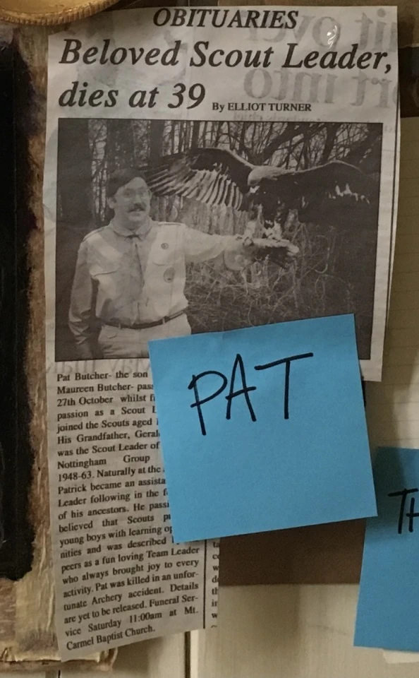 Then on one fateful day in 1984 (the 27th of October, according to the newspaper clipping from Mike's ghost board) Pat and the boys went to Button House to use the large expanse of the grounds for archery. While instructing the children on safety and the rules he let them pass around the bow and arrows only for one, Keith Darren Dean, to loose one and hit Pat directly in the neck; he then passed the bow to another boy as if hiding what he'd just done. Pat stumbled towards the coach and asked for one of them to call his wife while he tried to drive himself to a hospital, but unfortunately Pat's injuries were too severe and he crashed into a tree and died. He was 39, as stated on the newspaper article.