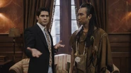 Meanwhile, Thor is talking with Flower in a different room. He reminds her that when everyone thought he was about to be “sucked off,” she said that she loved him. However, when he didn't go, she said “never mind”. Thor asks if there was any truth to what she said. Flower replied that there was, but she has intimacy issues and her previous relationship only worked because there was always a third person involved. It was that buffer that kept things from getting too intense. Thor suggests that maybe they should get a buffer too. Flower is intrigued, but isn't sure who could be the third in their relationship. Ari, looking at the watch, says that although it's rare, the condition isn't great. Trevor doesn't care about the watch, he tells Sam that he wants to hear about the old days. Sam asks Ari if there was a Trevor Lefkowitz in his group when he was hanging out with her uncle David. Ari, startled, replies “It’s hard to say. I knew a lot of Trevors”. Trevor not sure what's up, says they were bros. Sam asks Ari “Are you sure about that?” because her uncle did bring up Trevor's name quite a bit. Ari said that he thought Sam said she didn't know her uncle David very well... Trevor and the Ghosts are confused. Isaac tells Trevor “Surely, he must remember the night that you died.” Jay, oblivious to the Ghosts drama, is trying to see what Ari is saying about imperfections in the watch. Trevor, still trying to figure out what's going on with Ari, asks Sam to find out more about the night he died. Sam asks about a celebration at the Mansion for Pinkus's promotion that her Uncle David had mentioned to her in one of their “few chats.“ Jay wants to get back to the watch and Ari, shaken by Sam's questions about the night that Trevor died, jumps at the chance to change topics. Ari excuses himself saying that he has to make a phone call. Jay tells Sam that she's blowing his negotiations for the watch so Sam briefly explains to Jay what's going on. Trevor and the Ghosts try to figure out what is up with Ari. Flower and Thor are interviewing the Ghosts to be in their “throuple”. The Ghosts are puzzled by the strange questions being asked to them, for instance, how hairy their body is. As they begin to understand the purpose behind the questions, each of them declines and quickly leaves.